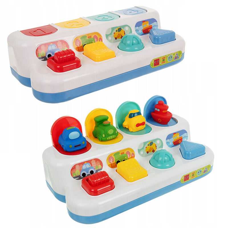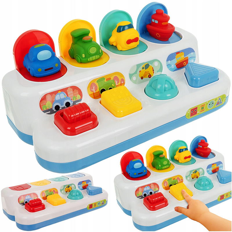 Interaktívna vzdelávacia hračka 4v1 s vyskakujúcimi autíčkami po stlačení tlačidla, otočení kolieska, prepnutí páčky či posunutí prepínača.