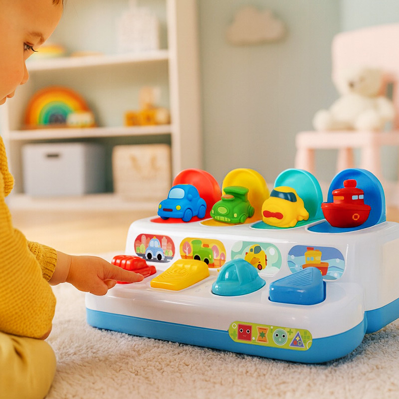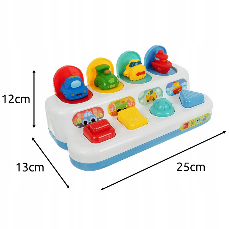 Hračka podporuje rozvoj jemnej motoriky, koordináciu ruka–oko a logické myslenie prostredníctvom zábavnej interakcie. Rôzne tvary tlačidiel a spôsoby ich stláčania stimulujú zmysly a rozvíjajú senzorické schopnosti dieťaťa. Kompaktné rozmery umožňujú jednoduché prenášanie a uloženie na stolík alebo koberec, ideálne aj na cestovanie.