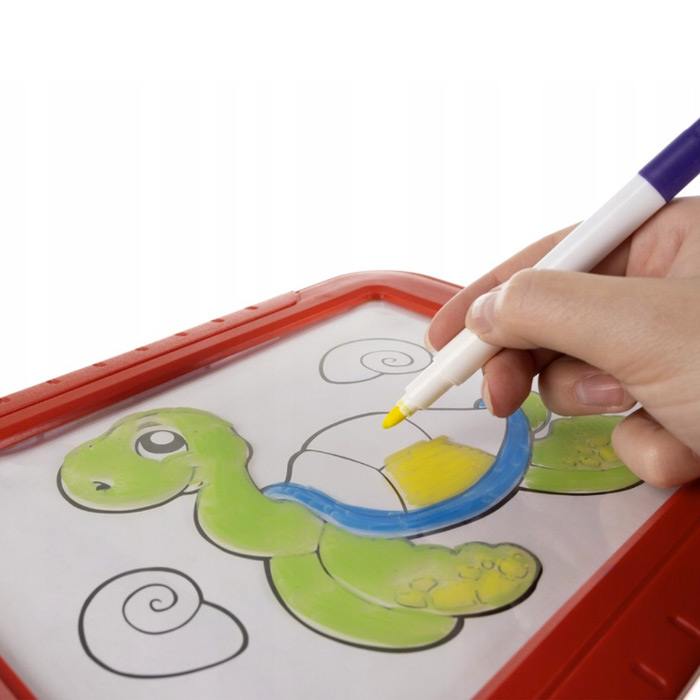 Do priehľadného panelu možno vložiť jednu z priložených šablón alebo vlastný obrázok a následne ho obkresliť a vymaľovať. V súprave nájdete aj fluorescenčné obojstranné fixky, ktoré spolu so zapnutým LED podsvietením vytvárajú skutočne efektný obraz. Tabuľa sa dá jednoducho zotrieť pomocou priloženej handričky.
