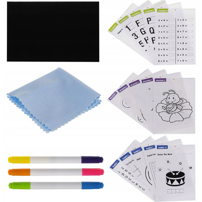 V súprave nájdete rôzne šablóny na obkresľovanie, ako aj karty s jednoduchými hádankami a hrami, vrátane kariet obsahujúcich jednoduché matematické úlohy a písmenká.