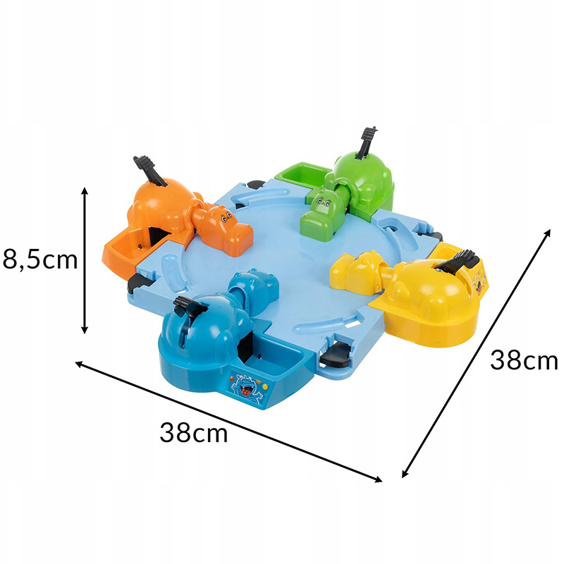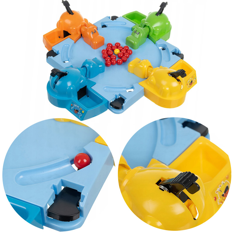 Zábavná hra Hladné Hrošíky prinesie smiech, súťaživosť a veľa radosti pre celú rodinu. Stačí stláčať páčku, aby hrošík otváral papuľu a „prehltol“ čo najviac guličiek. Jednoduché pravidlá zvládnu aj malé deti a dynamická hra rýchlo vtiahne do súboja všetkých hráčov.