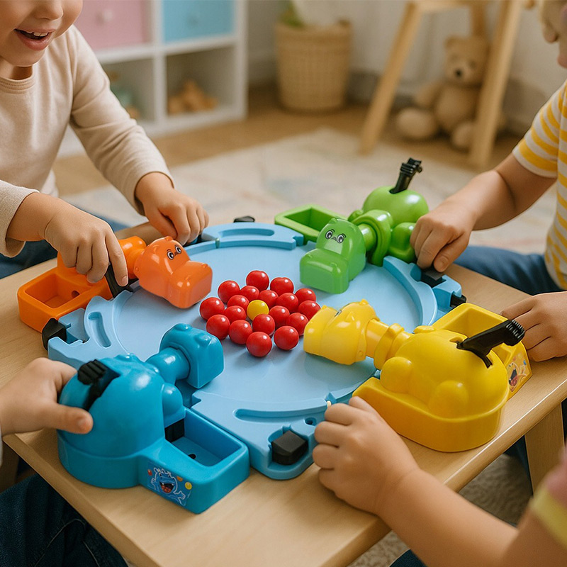 Zábavná rodinná hra Hladné Hrošíky rozvíja reflexy a koordináciu detí, prináša smiech a napínavú súťaž pre 2–4 hráčov.