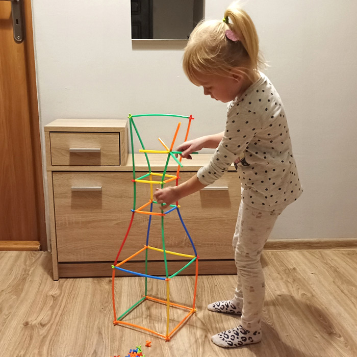 Táto farebná stavebnica je ideálnou hračkou na rozvíjanie jemnej motoriky a kreativity detí. Obsahuje až 204 kusov slamiek a 204 kusov spojok, ktoré sa spájajú do väčších celkov – či už to bude domček, auto alebo raketa.